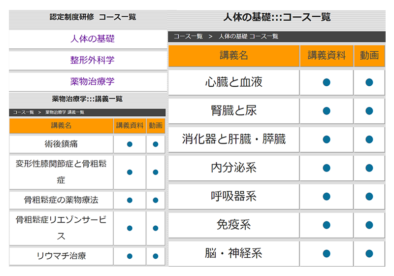 院内専用のサイトを用いて、学びたいスタッフが自分の好きな時間に整形外科学や基礎疾患、治療法、生理学や薬理学の勉強ができるツールがあります。
